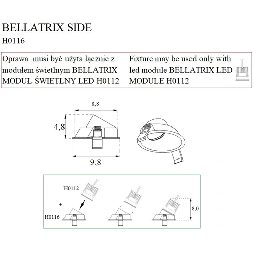 Oprawa do zastosowania z modułem świetlnym H0112H: 4,8-7,8 cm (z modułem: 7,8 cm) Ø: 9,8 cmOtwór montażowy/mounting hole: Ø: 9,0 cm