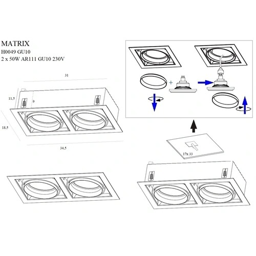 Moc/Power: 2 x 50W AR111 GU10 230VW: 34,5 D: 18,5 cm H: 11,5 cmOtwór montażowy/Mounting hole: 33 x 17 cm